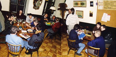 Wahrscheinlich aufgrund des Feiertages waren heute nicht sehr viele Gäste anwesend: Andreas, Emanuel, Erich, Karl Heinz, Manfred, Martin, Michael, Roman, Teresa, Thomas und Wolfgang. Das Dutzend voll machte ein neuer Gast, nämlich Martin Erasmus, Mitveranstalter der Wiener Kohlmus Comic-, Figuren-, Film-, SF- und Schallplattenbörsen, die in regelmäßigen Abständen in der Berufsschule Längenfeldgasse stattfinden.