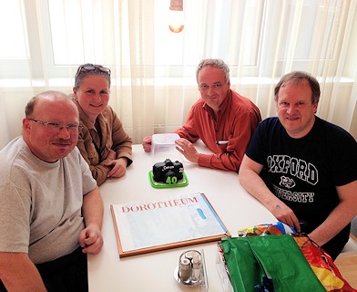 Zunächst wurde recht lange über das Thema Recycling geplaudert, dann über das Thema „Hygiene in Großküchen“ und schließlich fanden wir mit „Dr. Who“ wieder in altbekannte Gefilde zurück. Verena outete sich als Fan der Serie, ebenso wie Georg, der sogar mit dem geeigneten Outfit des vierten Dr. Who erschienen war. Und über diese Schiene kamen wir dann zu den Zeitreisen, zu denen es eine breite Meinungsvielfalt gibt.