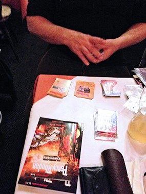 Der Verlag VPM hatte uns dankenswerterweise mit Fanmaterial versorgt, das wir nicht nur für diesen Abend, sondern auch für die kommende Rhodan-Präsentation bei der »Vienna ComiX« gut brauchen konnten. Und so musste Verena nicht nur für die anwesenden Gäste Romane und Autogrammkarten signieren, sondern auch gleich im Voraus für die Besucher der Comic- und SF-Börse, aber das ist eine andere Geschichte. Auch Roman wurde immer wieder mal sein STARDUST-Roman Nr. 2 vorgelegt, ansonst war von den heimischen Autoren leider keiner anwesend. Michael Marcus Thurner musste wegen der üblichen Arbeitsüberlastung absagen, aber dafür würde er übermorgen zur Börse kommen.