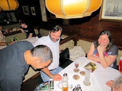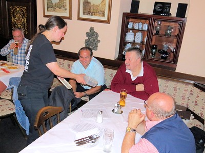 An diesem Stammtischabend in »Adams Gasthaus« wurden wir gleich mehrfach kulinarisch verwöhnt – zuerst von Verena, die ein Tupperwaregeschirr voll Feigen aus Eigenanbau dabei hatte, dann von Irene, die extra für diesen Abend kleine Karottentortenstücke gebacken hatte und nicht zuletzt vom Adams, das wie immer eine gut bestückte Speisekarte vorzuweisen hat. Diesmal waren gerade die »Innereienwochen«, die natürlich nicht jedermanns Geschmack sind, aber einige Beherzte griffen gerne zu sauren Nieren, gebackener Leber oder Hirn mit Ei. Damit erntete der Kellner auch einen kleinen Lacherfolg, als er fragte, wer denn das Hirn bestellt hätte und nur Rückmeldungen wie »Ich kenne wen, der das brauchen würde« erhielt. Zuletzt fand das Hirn aber dann doch einen Abnehmer.
