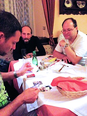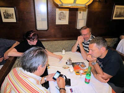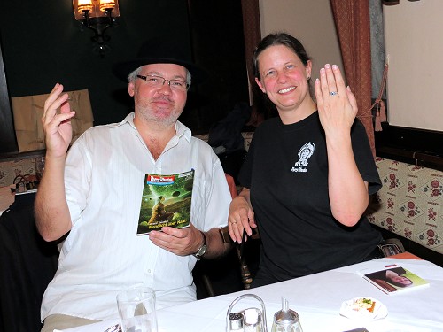 Aber alles der Reihe nach. Es war schon länger geplant, wieder einmal einen Ehrengast, sprich Rhodan-Autor, aus Deutschland einzuladen. Die Wahl war relativ rasch auf Verena Themsen gefallen, da sie bisher noch nie bei einem Wiener Con oder Stammtisch dabei war. Und so kam sie an diesem Freitag mit Mann Jörg angereist und erwartete bereits um 19:00 Uhr die ersten eintreffenden Fans. Und die Fans kamen zahlreich – Manfred, Emanuel, Claudia und Erich, Gerhard H., Klaus, Hans-Peter, Charly, Hermann, Andreas L., Martin, Karl Heinz, 2x Thomas, Hannes, Georg, Roman und Iwi, Wolfgang, Irene und Roswitha (die übrigens heute ihren Schnapszahlbesuch Nummer 111 hatte) machten der Autorin die Aufwartung.