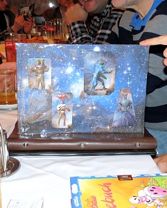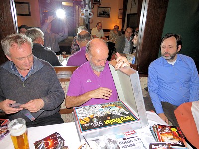 Über die Tische verteilt waren wieder viele Rhodan-Utensilien zu finden. Für das dritte PR-Stickeralbum werden noch etliche Klebebilder gesucht, die ESPost der Münchner Stammtischfreunde lag in gedruckter Form zur freien Entnahme auf und auch der Verlag hatte einiges an Werbematerialien geschickt, das von Erich gleichmäßig im Raum gestreut wurde. Ebenfalls dabei – aktuelle Kataloge vom SPLITTER-Verlag, der einigen Comicfans wieder eine Menge Geld aus der Tasche ziehen würde. Martin hatte eine seiner selbstgemachten Risszeichnungsboxen dabei, die vor allem von den Neuen in der Runde bestaunt wurde, und der Inhalt natürlich nicht weniger. Ganz nostalgisch wurde in den alten Risszeichnungsbänden geblättert und über die gute alte Zeit geredet.