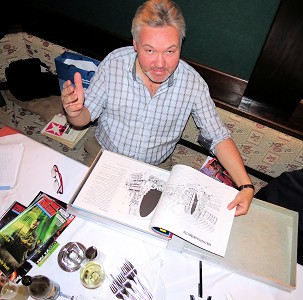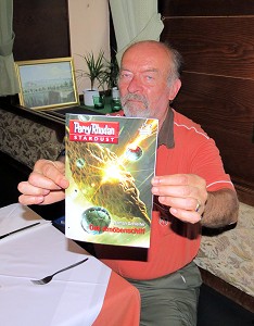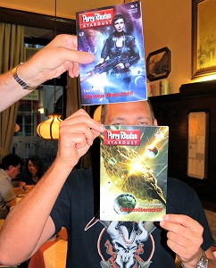 Das Schreibseminar von MMT ist mittlerweile auch Geschichte, und das im wahrsten Sinne des Wortes. Die Teilnehmer haben gemeinsam eine Fantasy-Story geschrieben, die auch veröffentlicht werden soll. Mit Annabella und Hans waren zwei der Teilnehmer anwesend, der ebenfalls beteiligte Schreiber Roman kam erst zu später Stunde. Der hat aber bereits etwas ganz anderes vorgelegt, nämlich seinen ersten Roman aus dem Perryversum, der soeben als Nummer 2 des PR-Spin-offs STARDUST erschienen ist. Den musste er natürlich gleich fleißig signieren, und die Wenigen, die ihn bereits gelesen hatten, gaben äußerst positive Kommentare zum Roman-Roman ab.