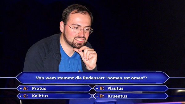 Um jetzt zuletzt auch noch den heutigen Bildungsauftrag zu erfüllen – die Redensart „nomen est omen“ stammt ursprünglich vom römischen Dichter Plautus (um 250–184 v. Chr.), der in seinem Stück Persa (Der Perser) die Formulierung nomen atque omen (lat. „Name und zugleich auch Vorbedeutung“) verwendete. Das fällt zwar ziemlich sicher in die Kategorie „Unnützes Wissen“, aber wer weiß, vielleicht ist das ja mal die Millionenfrage in einer Quizsendung. Aber dann bekomme ich eine Gewinnbeteiligung!