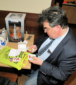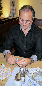Und dann wurde ausgepackt! Irene hatte eine große Schachtel MAGIC-Karten dabei, die sie aus einer Altpapiertonne gerettet hatte und jetzt einen Recycler dafür suchte – der in der Runde auch relativ rasch gefunden war. Außerdem hatte sie eine Dose selbstgemachter Weihnachtskekse mitgebracht. Zunächst meinten die Meisten, sie hätten zu den Feiertagen ohnehin schon genug Süßes gegessen, aber nachdem der Erste über die herrlichen Vanillekipferl geschwärmt hatte, waren die Leckereien rasch weg.