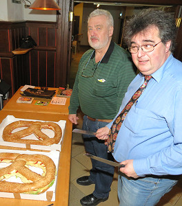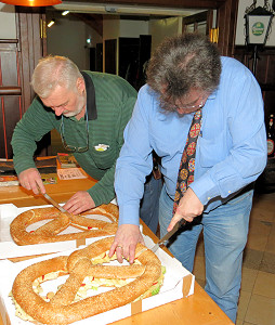 Zunächst galt es einmal, Tische zu schieben und eine stammtischgerechte Sitzordnung herzustellen. Für die Verpflegung der Meute hatte Erich zwei gefüllte Riesenbrezen vom Merkur und Knabbergebäck gesponsert, Wolfgang brachte alkoholfreie Getränke mit und Thomas war für das Bier zuständig – »Wer, ich?« Nun ja, immerhin konnte jeder beruhigt mit dem Auto heimfahren.