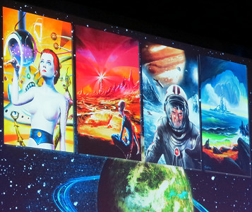 Das »F«-Wort wurde diesmal von den Verantwortlichen selbst ausgesprochen, bevor die Fans danach fragen konnten: Film. Das leidige Thema einer Verfilmung des Rhodan-Stoffes zieht sich fast schon so lange dahin wie die Frage nach dem Dimesextatriebwerk (siehe oben). Zur Abwechslung gab es diesmal jedoch eine kleine Fortschrittsmeldung, dass gerade ein Drehbuch zur Begutachtung eingereicht worden war. Man darf gespannt sein! Auch sonst gab es interessante Infos zur Serie, wie etwa das geplante Erscheinen von gleich drei (!) neuen Miniserien 2016 oder die Covergestaltung der Hefte 2824 bis 2827 im Stile von Johnny Bruck durch die aktuellen Zeichner. Dazu wurden auf der Leinwand die bereits fertigen Bilder im Rohzustand – also ohne Titel oder sonstige Beschriftungen – gezeigt.