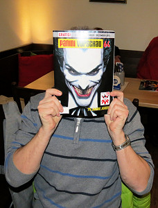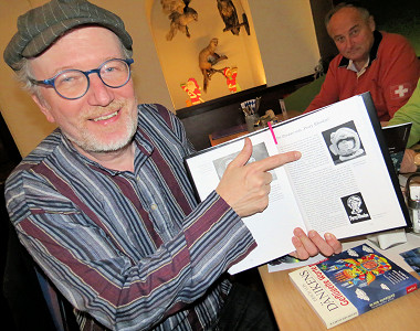 Wolfgang schleppte sich trotz Husten und Schnupfen zum Stammtisch. Dafür hatte er dann Schätze von einem Comicfestival mitgebracht. Ich glaub, er war wieder in Frankreich, er kann es aber auch aus Deutschland mitgebracht haben. [Anmerk. d. Red.: Angoulême in Frankreich] Wie immer rief sein schwarzes Buch bei der Comic-Fraktion Hochachtung hervor.