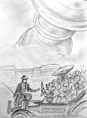 Ab sofort laufendes Thema ist natürlich die PERRY RHODAN-Convention, die nach sechs Jahren wieder einmal in Wien stattfinden soll. Die ersten Weichen wurden gestellt, die Maschinerie läuft langsam an und nimmt Fahrt auf. Von Franz Miklis (»Das sind ja tolle News, Date ist gesafed und – ja natürlich würde ich mich freuen, wieder ein nettes Motiv beizusteuern!«) liegen bereits die ersten Entwürfe für das Con-Motiv vor und die Entscheidung ist schwierig. Schließlich kommt heraus, es könnte eine Mischung aus beiden sein, also das Gloriette-Motiv und rechts unten im Vordergrund noch Figuren oder sonstige Elemente. Die Idee, dass Takvorian die Kutsche ziehen könnte, wurde aber rasch wieder verworfen.