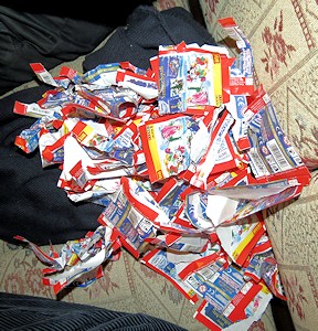 Der nächste Auspacker und Verteiler war Thomas K., der zwei dicke Bündel der neuen BILLA-Sticker-Säckchen für das Disney-Weihnachtsgeschichten-Album dabeihatte. Damit hatte Erich mindestens eine halbe Stunde zu tun, die Sticker zu ordnen, und es schlossen sich gleich einige andere Sammler an, um vielleicht heißbegehrte Stücke wie die Nummer 20 oder den Tattoo-Sticker T7 zu finden.