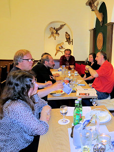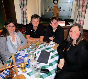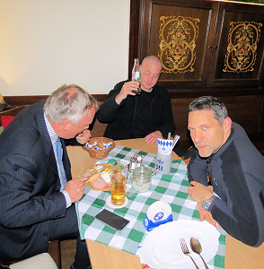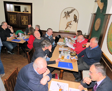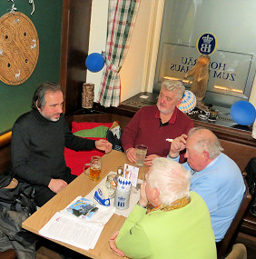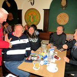 Wer war denn heute aller da? Franz, Martin, Manfred, Andreas L., Hermann, Charly, Klaus, Irene, Roman, Michael M. Thurner, Wolfgang, Uwe, Gerald, Claudia und Erich mit Nicole fanden sich im Extrazimmer des »Hofbräu zum Rathaus« ein, in dem es heute hoch herging. Vorne im Lokal musste man sich richtig durchkämpfen, da haufenweise Leute wegen des »Maibockanstichs« gekommen waren. Aber keine Angst, es kam kein Tier zu Schaden, es wurden offenbar nur einige Gäste vom Bier angespritzt, als das Fass angeschlagen wurde, wie man auf einigen vom Lokal auf der Homepage geposteten Fotos sehen kann.