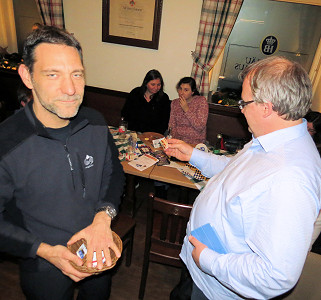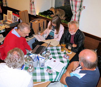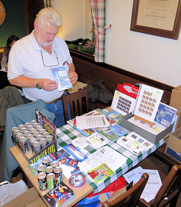 Raimund Peter spielte diesmal zentrale Datenverteilungsstelle. Er hatte seinen Laptop mit allen Bildern und Videos vom Con dabei, und daneben stapelten sich die Datensticks der Gäste, die alle bespielt werden wollten. Erich brachte noch Dosen, Quartette und Briefmarken unter die Leute, um einerseits das Gewicht zu verringern, das am Ende des Abends wieder ins Auto geschleppt werden muss und um andererseits der Stammtischkassa noch etwas Bares zuzuführen, auf dass bei der Conwochenendeabrechnung zumindest eine schwarze Null unter dem Strich rauskommt. Die Mitwirkenden haben mittlerweile fast alle ihre Ausgaben eingemeldet und es sieht ganz gut aus. Außerdem würden am jetzigen Wochenende, also morgen und übermorgen, auch noch einige Euros in die Kassa kommen, da wir wie jedes Jahr bei der Vienna ComiX mit einem Stand vertreten sind und dort ebenfalls speziell die Con-Goodies anbieten wollen. Dafür beschäftigte sich Roswitha einen Gutteil des Abends damit, die Quartettkarten zu sortieren, da es ja bei der Börse keine Tauschmöglichkeiten geben würde.