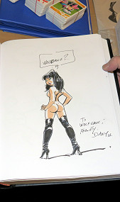 Kommen wir jetzt endlich zu Perry? Jein. Wolfgang präsentierte seine Errungenschaften vom Comicfestival in Angoulême, und da waren wirklich tolle Widmungszeichnungen dabei, allen voran ein Lucky Luke aus der Feder von Achdé, dem Nachfolger von Morris, dem eine große Ausstellung mit bisher noch nie gezeigten Originalblättern aus dem Nachlass gewidmet war. Aber auch sonst gab es sehr nette Zeichnungen, die ich hier gerade noch als »jugendfrei« durchgehen lasse.