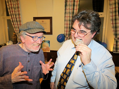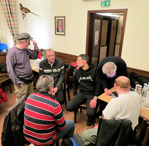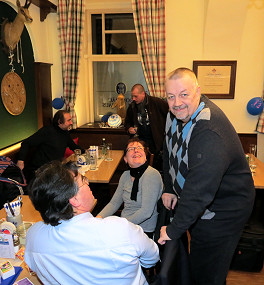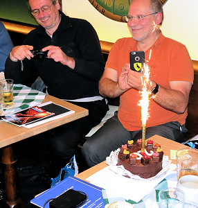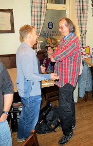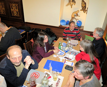 Aber jetzt will ich die Foto-Neugierigen nicht mehr viel länger aufhalten. Es war eine rauschende Fan-Nacht, die aber trotzdem vor Mitternacht zu Ende ging. Zuletzt saßen noch zwei Runden im Zimmer, die sich über Gott und die Welt, Politik und sicher noch einiges andere unterhielten. Und gemäß dem Motto »Die Letzten beißen die Hunde« war noch eine Rechnung von 20 Euro zu zahlen von Bestellungen, die offenbar im allgemeinen Durcheinander untergegangen waren. Falls jetzt jemand ein schlechtes Gewissen hat – ich bin beim nächsten Stammtischabend, der am 1. April stattfinden wird, da.