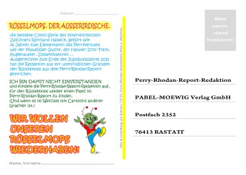 [Nachtrag der Red.: Auch bei der Comicbörse sind die RHODAN-Devotionalien gut angekommen, insbesondere die Getränkedosen und die Briefmarken. Und viele Besucher haben uns auf die Fernsehbeiträge angesprochen. Mehrere PR-Leseproben wurden insbesondere jüngeren Besuchern mitgegeben und einige ältere erinnerten sich an ihre früheren Lesegewohnheiten.]